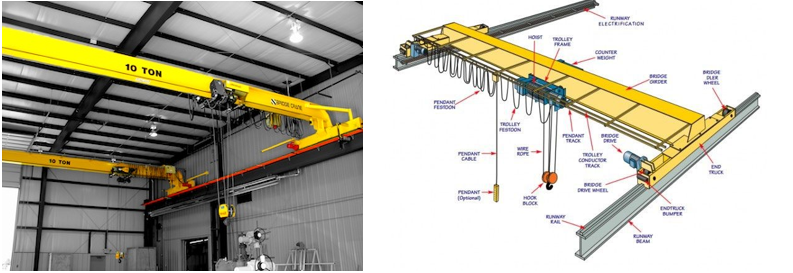 این نوع از جرثقیلهای سقفی بهترین انتخاب در مواردی هستند که دهانهی سالن (یا فضای کار) بیشتر بوده و ظرفیت بالایی مورد انتظار است چراکه ساختار آن امکان حمل کالاهای سنگینتر و اختیار عمل بیشتر در انتخاب مسیر حرکت را فراهم میآورد. در تصاویر زیر ساختار شماتیک و یک نمونهی اجرا شده از این نوع جرثقیل را مشاهده میکنید.