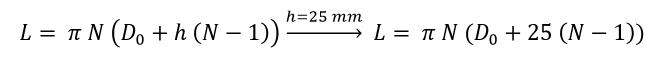 با به دست آمدن تعداد دورها، طول ورق نیز از فرمول زیر محاسبه میشود که در آن N، تعداد دورهای به دست آمده در مرحلهی قبل و D0، قطر داخلی رول به میلیمتر خواهد بود: